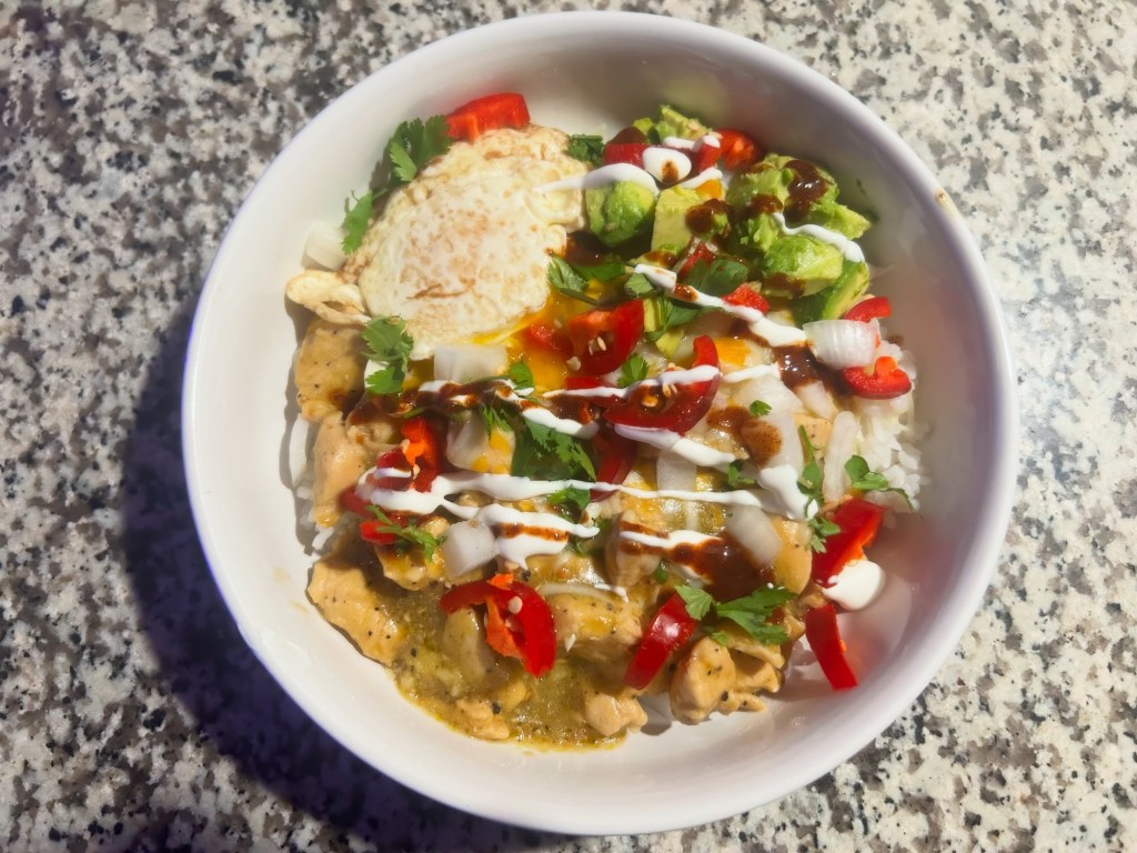 Fajita seasoned chicken with Bella peppers and onion over Spanish rice and topped with queso.
