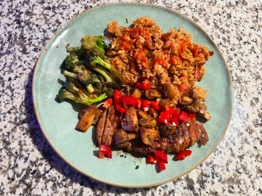 Teriyaki pork loin, fried rice and broccoli.