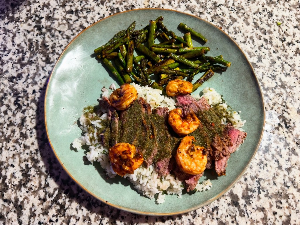 Chimichurri steak and shrimp with a cilantro line rice and asparagus.