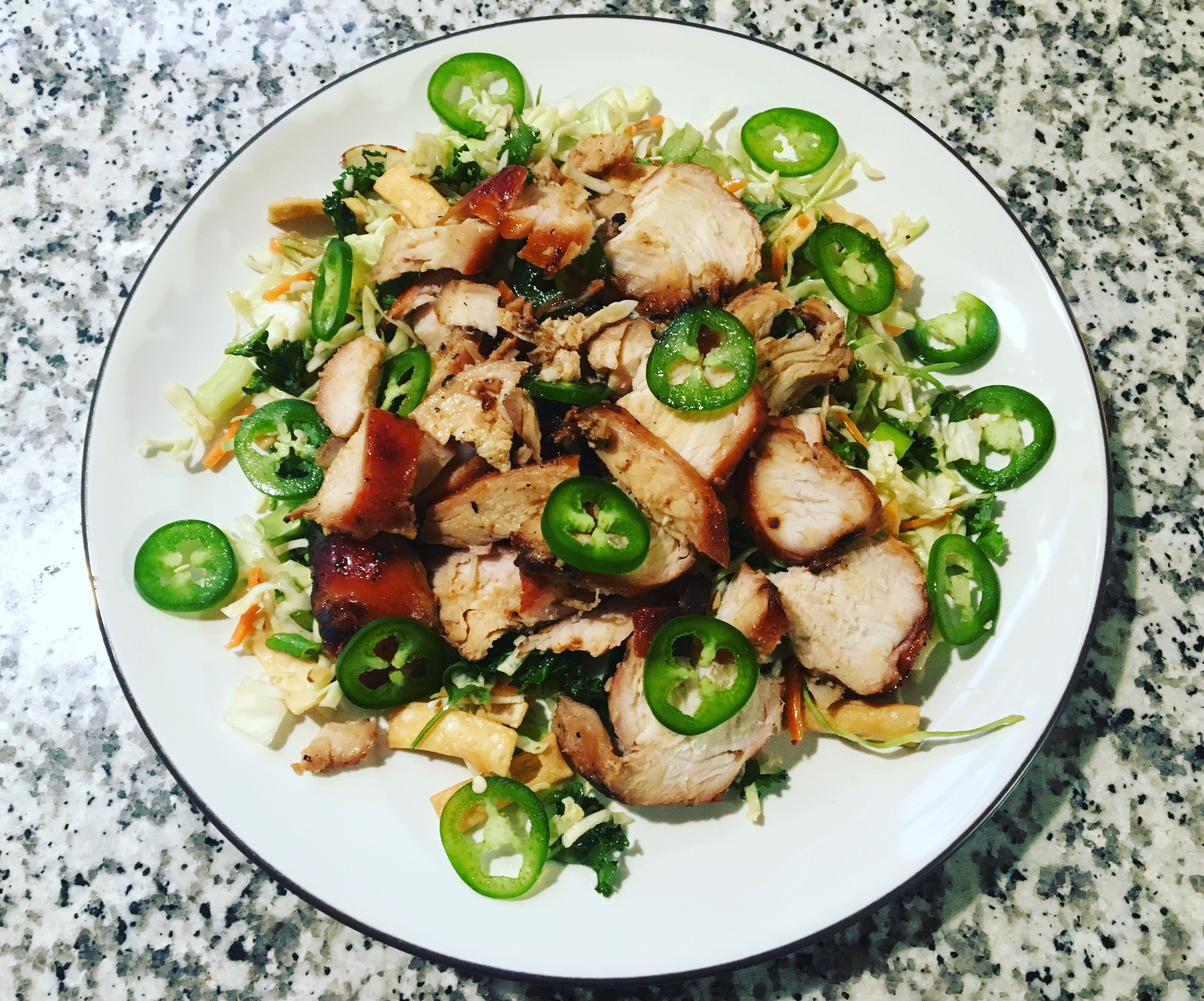 Thursday it was warm enough for a salad. I decided on chicken teriyaki with a sesame ginger dressing. Jalapeños because, why not? A very simple summertime meal.