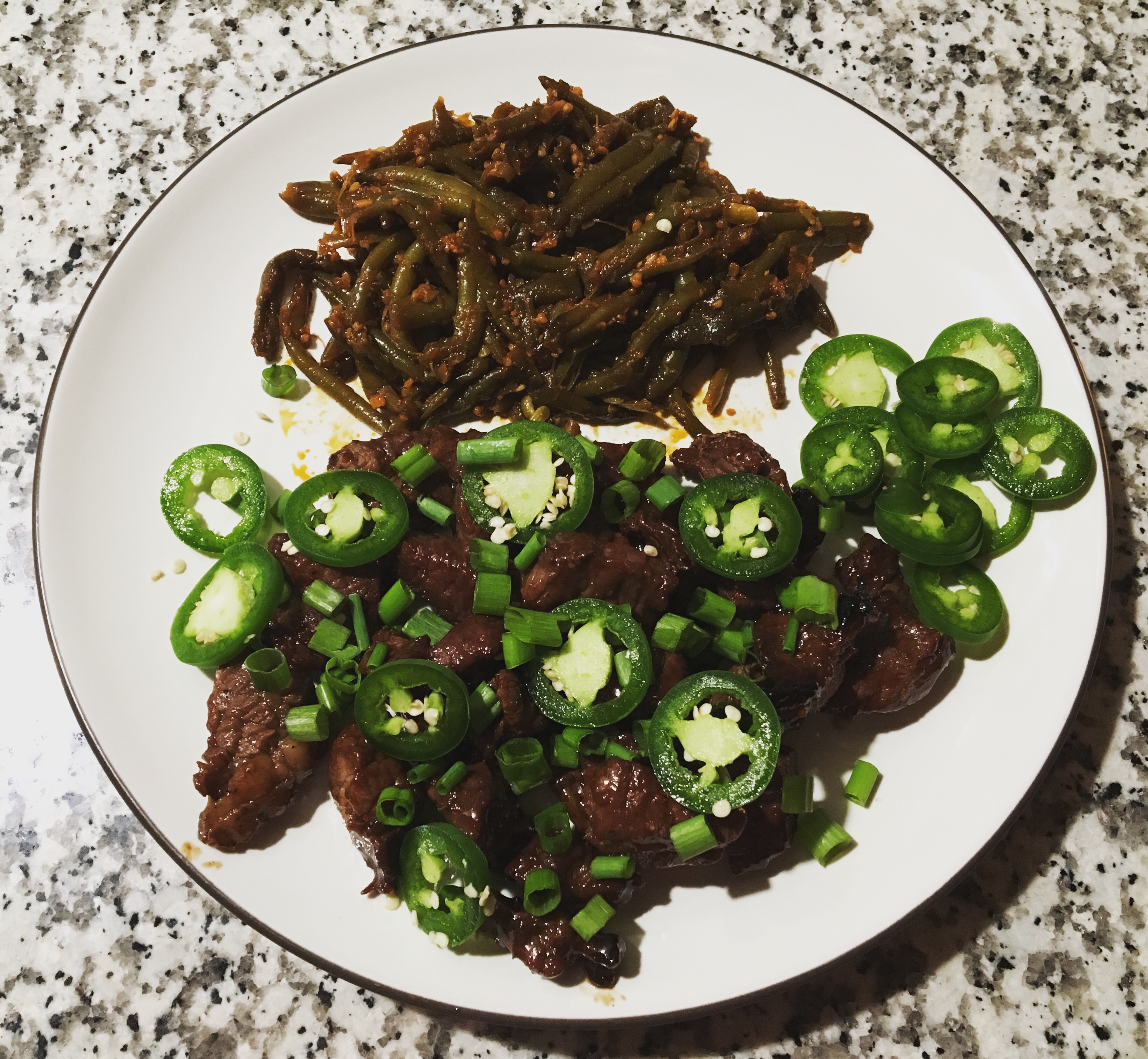 Hoisin steak with sriracha green beans. Pretty basic. If you don’t cook with hoisin sauce, you really should correct that. It’s even better on chicken.