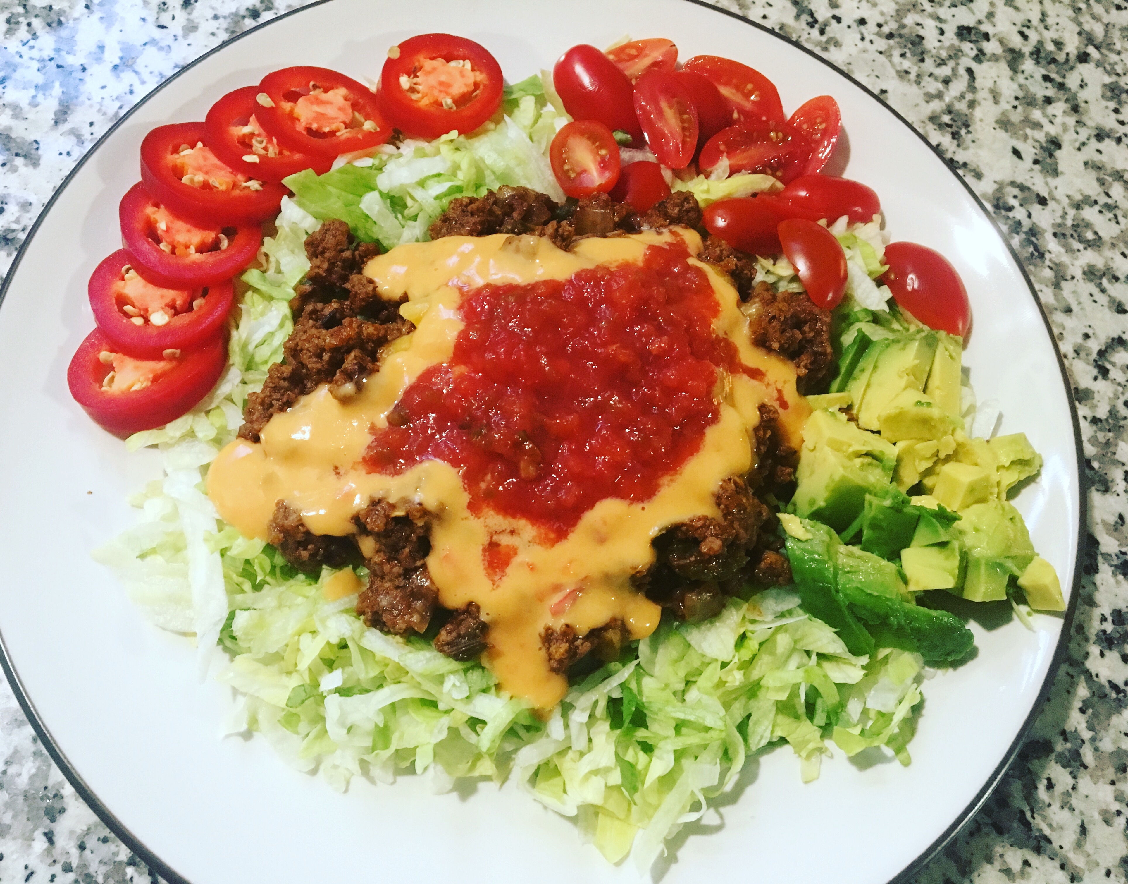 Taco Salad w/ queso. Why in the world I never poured queso on a taco salad before is beyond me. I told myself it’s because the lettuce would wilt, but that makes no sense because the warm taco meat would do the same. I guess I was just being willfully dense. Anyway, what a dish this became.