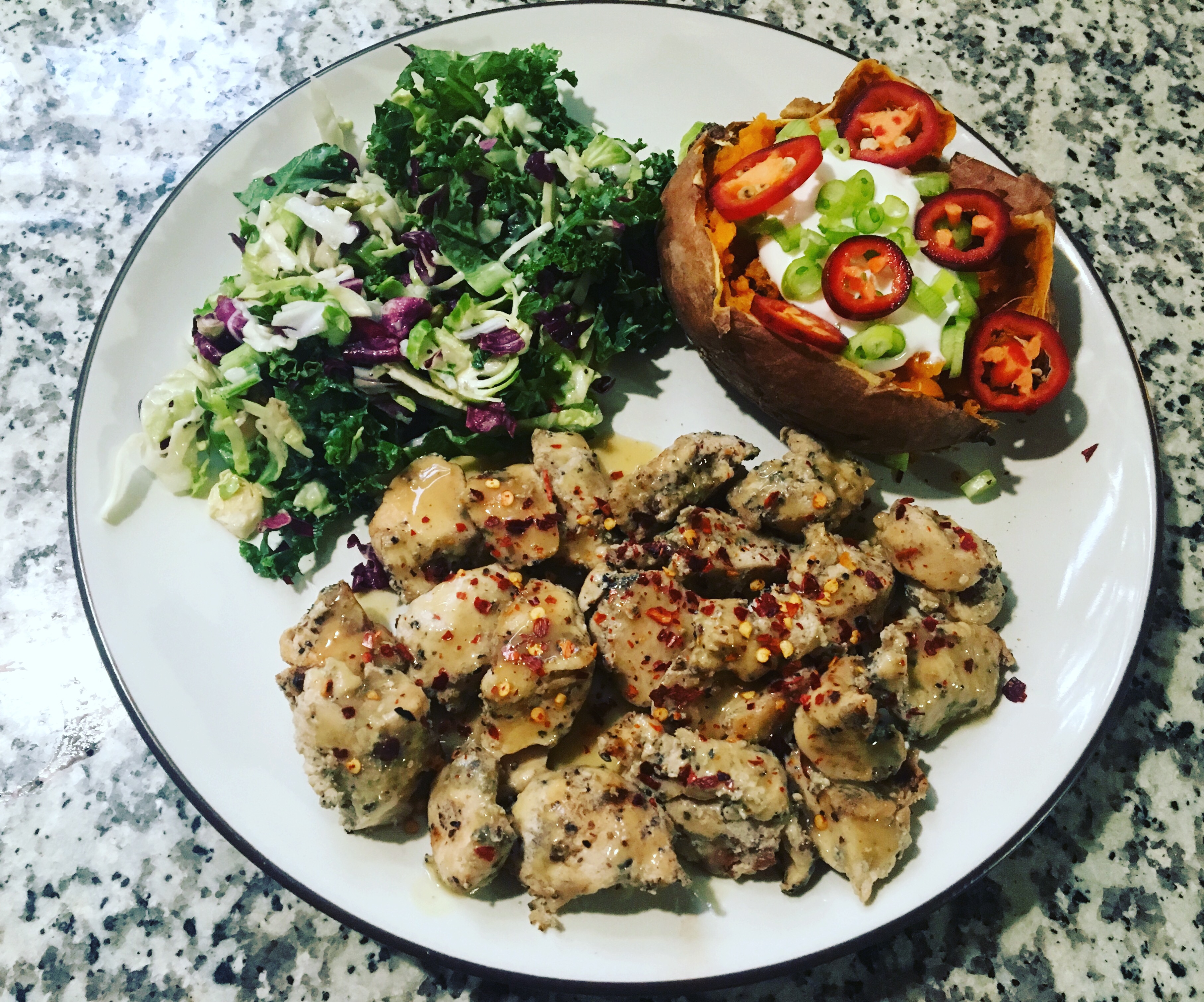 White wine Worcestershire sauce. Anyone remember this stuff? How fantastic it complements chicken. Good luck finding it. I still have a bottle that is remarkable still good. Anyway, this was one of our go to meals. Chicken with that sauce, sweet potato w/Greek yogurt, and a sweet kale salad.