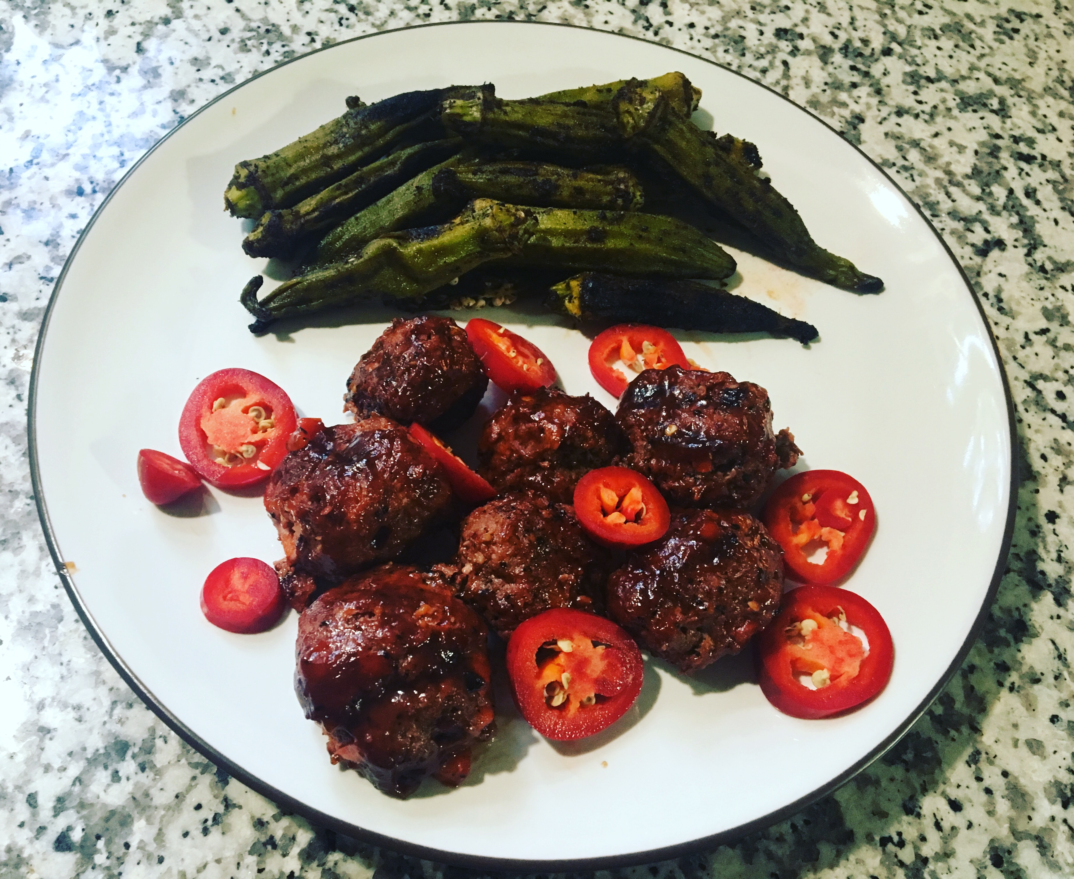 BBQ grilled meat balls. This was kind of a letdown to me. I had high hopes and after eating this meal I don’t think I will be making them again. At least it was a fun experiment. Maybe it would have been better had I used ground chicken? Who knows…?