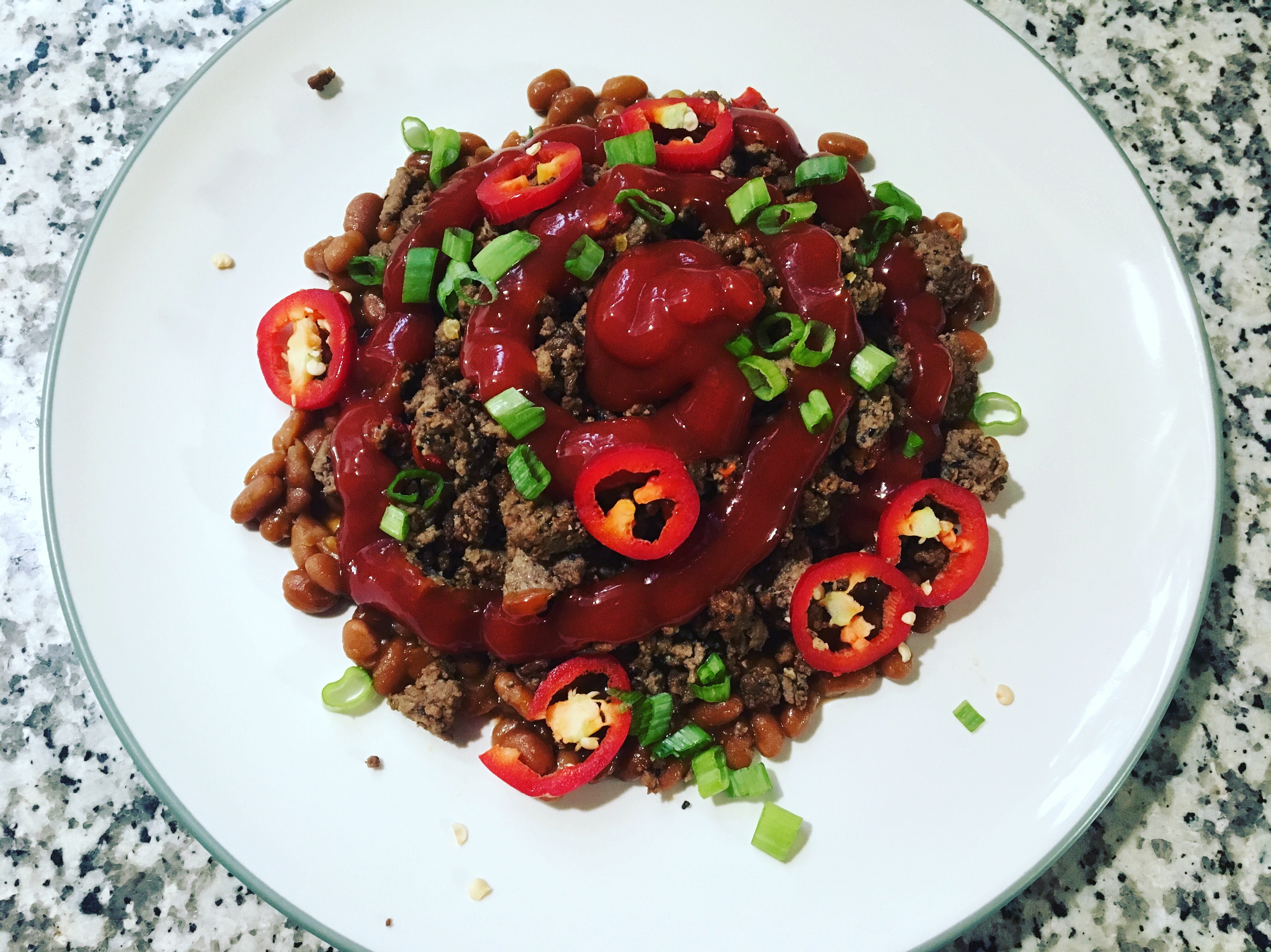 Seasoned ground beef over baked beans. Doesn’t get simpler than that. I was left satisfied.