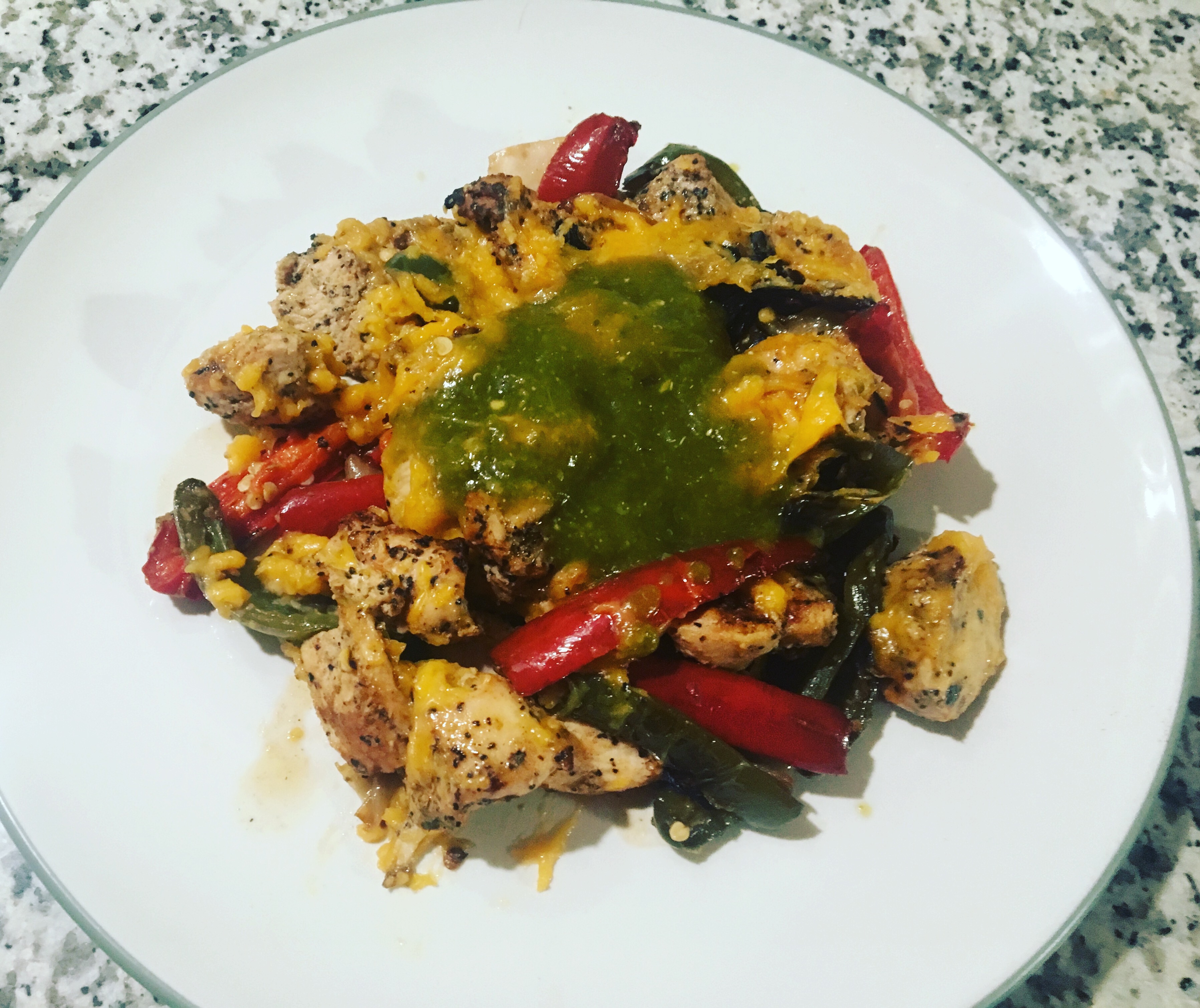 Grilled chicken, onion, with red & green jalapeño. Topped with sharp cheddar and something precious. Julio’s green sauce!!! How could this mean not be good? And again, leftovers. This time because the meal was too HOT for Bekah. They were even better the next day.