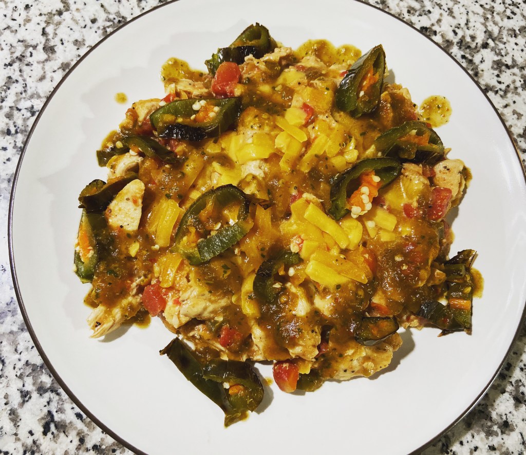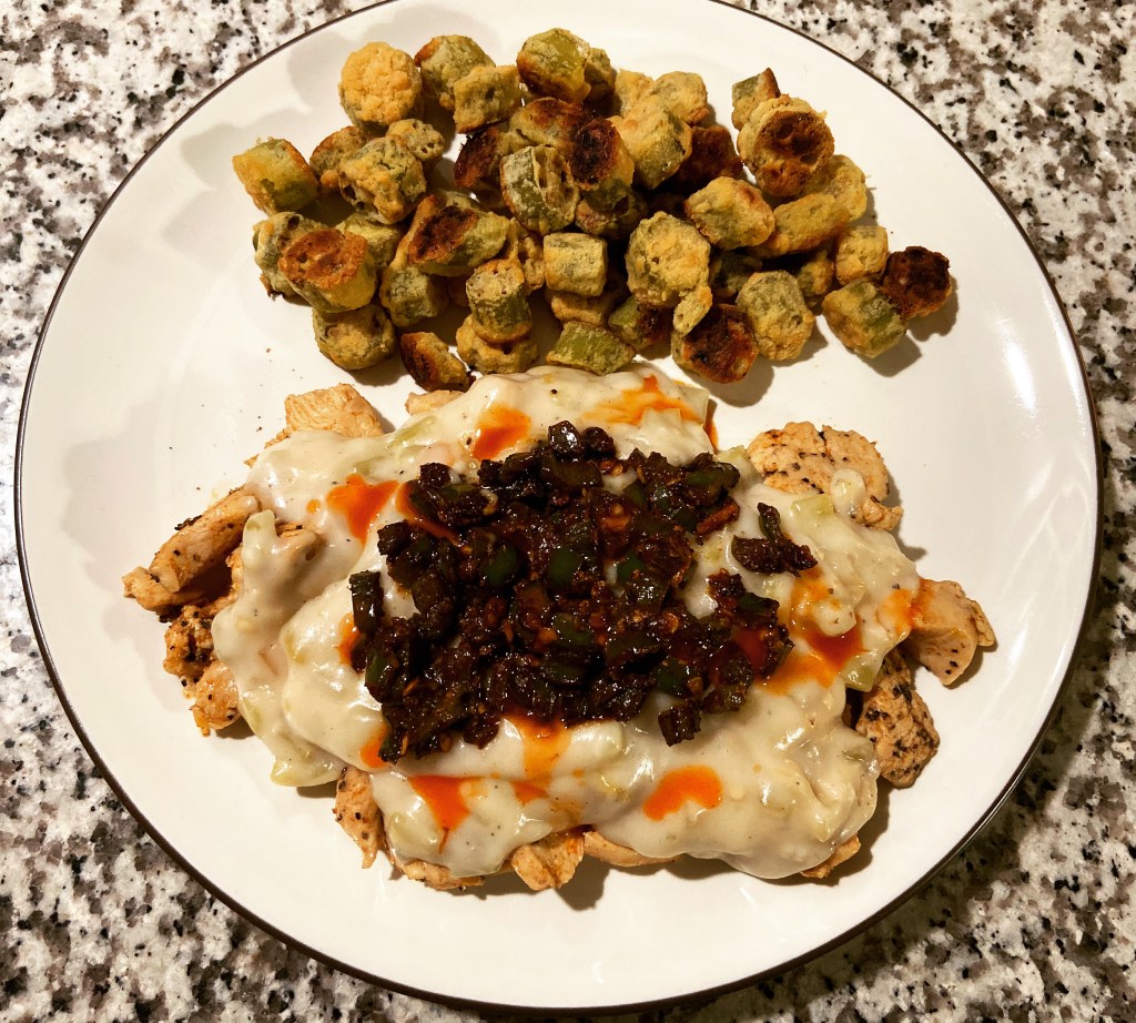 Night 2.   I made a green chili gravy for some grilled chicken.  Backed some breaded okra, a healthier way to eat it.  The topping you see there is some caramelized jalapeño.  Again, this would have been too warm for my dear wife.