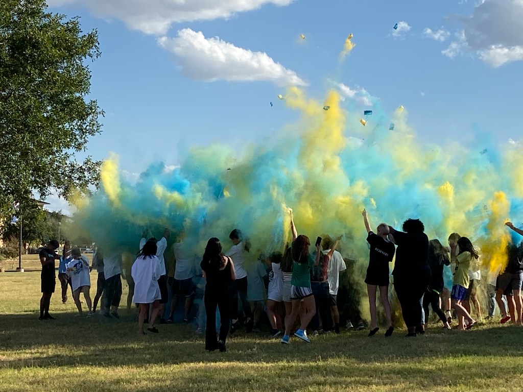 I was able to sneak away from work and catch the Blue & Gold Party.  Lucky that I have somewhat flexible hours.  I was all smiles.  How easily I am entertained.  Watching the blue and gold powder launched into the air.  It was soooo cool.   (It’s corn starch, btw.  Thanks, Jamie.  Everyone I asked had no idea.)   How it mingled together to form a green fog.  Said green fog nearly engulfed me, as I was standing down wind.  It was a good time.  You really had to be there.  Or maybe it’s just that I’m a nerd.  That’s up in the air for debate.
