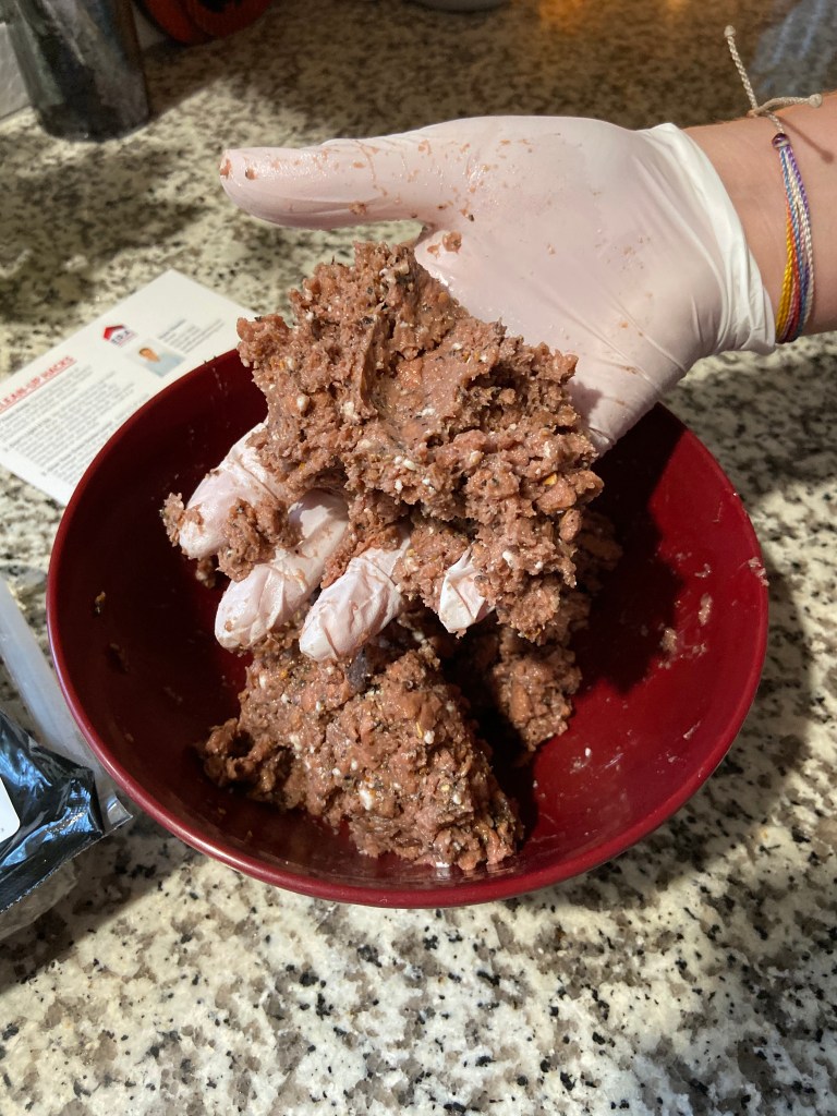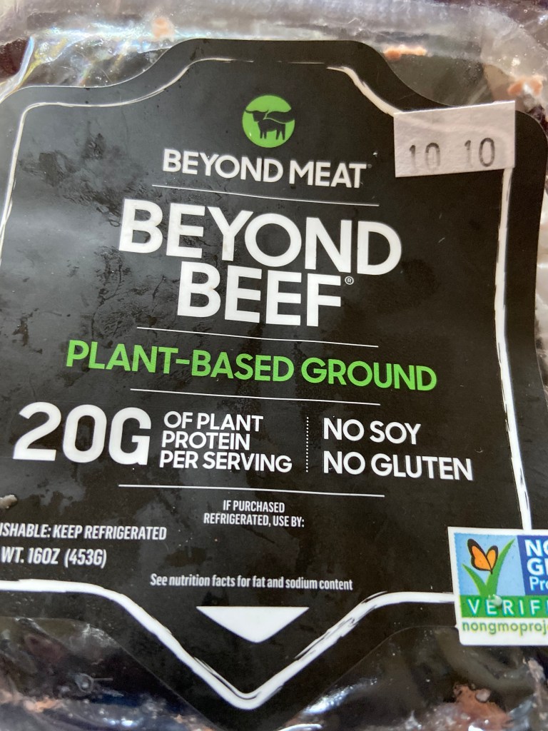 Bekah is back.  Another experiment.  This time with “Beyond beef”.  She was going to make her famous Bekah Burgers with plant based protein.   She opened the package.  Said it smelt like SPAM.  I leaned in.  No, it smells like cat food.  She said the texture was off putting as well.  No way were we eating something that initially smells like cat food.  Dinner failure.  Like, it stunk up my kitchen for a good 20 min after we disposed of it in the outside trashcan far away from the house.
