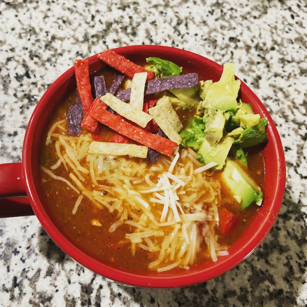Tortilla soup.  We finally have some soup weather.   Even if I hadn’t planned on making soup Friday, I would have by the end of the day.  I had at least a 10 min conversation with one of the deans about spicy soup.  Soup was on the brain after that.  It was pretty amazing.  The first soup of the year usually is.