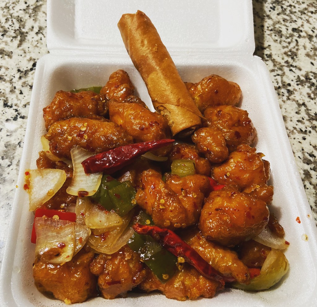 With nothing else in the house to cook it was decided carry out would save the day.  We picked up some Ban Moon.  I got the spicy chicken, 5-pepper hot w/ a side eggroll.  It was delicious.  I was a happy camper.