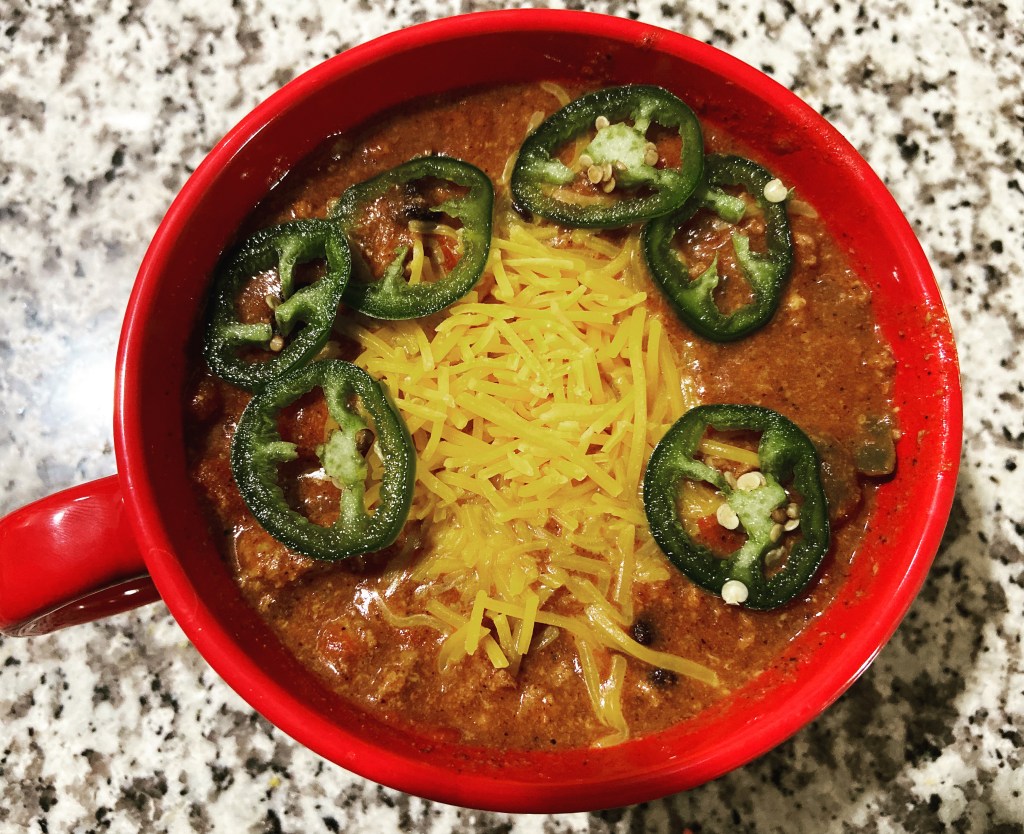 Chili.  Traditional?  Not really!  I was supposed to make it traditional but that just didn’t happen.  Oops.
