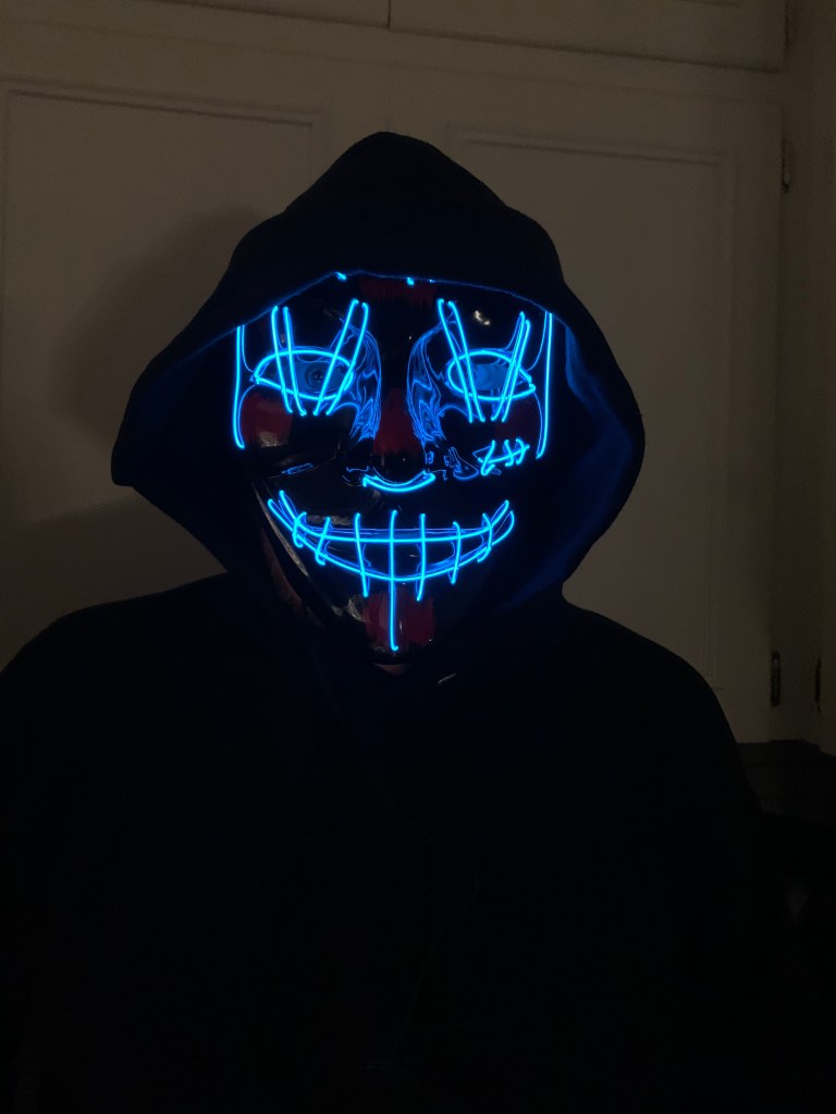 I also still dress up some.  Nothing elaborate, you can do a lot with a little improvising.  Devil horns and a suit.  Bear mask and a suit.  This year I went a little scary.  Glowing mask and a black hoodie.  Hope the kids were not too afraid to come back again next year.  I would think the amount of goodies we gave them will encourage a trip back next year.  I LOADED down on candy.