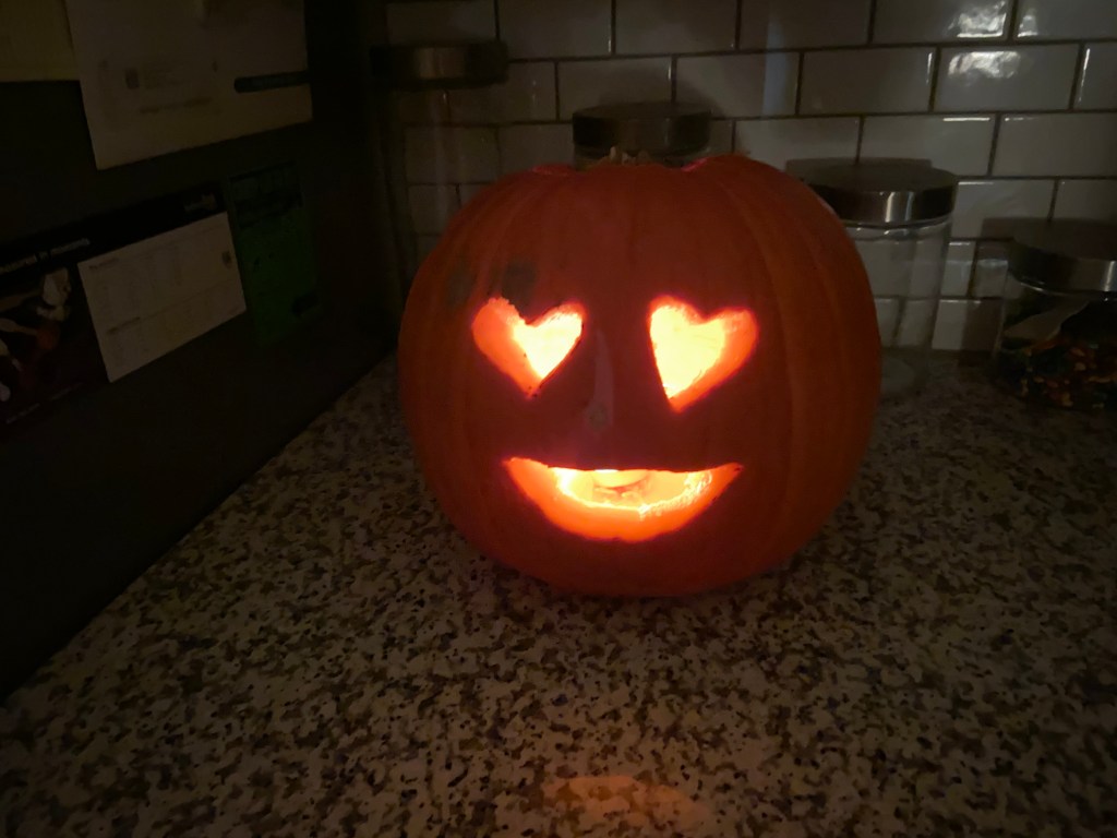 I still have a good time carving pumpkins.  Either blindly setting upon it with the knife, or drawing out a design beforehand to make something truly cool.  The end result is always special.  The smell of pumpkin.  The scents not good but it bring on good feelings. I don’t do it as often as I would like because I hate to ruin a perfectly good pumpkin when it can later be repurposed as Christmas decorations.  So last min we decided let’s do it, we always have fun.  I went to HEB.  They were out of all but the fancy fairy pumpkins.  Well s***!  Bekah was going to Market Street for soup so I called her up.  GET PUMPKINS!!!!  They had plenty, no worries.  And we carved and had a great time doing it.