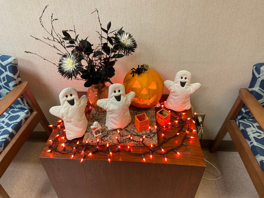 Halloween week started off cold & cloudy with a couple days with 80% chance of rain.  We did not get that rain unfortunately.  I kind of feel we get more rain on the days we have less chance for rain.  Anyway, the day arrived w/ temps in the lower 20’s with real feel at 17.  The sun was out in all its horrible glory.  I guess I should feel blessed that I had 3 days of wonderful gloom but I really wanted it to last longer.  Oh well.  I should just go ahead and move to Seattle if I’m going to complain about the sun every dang day its out.  My closest campus friends all showed up w/ a little Halloween spirit in their attire.  I had my ghost & pumpkin buttons on.  Some people went full costume.  I was probably walking around with a stupid grin on my face most the day enjoying the students & faculty/staff that did dress up.  The Llama tried to ruin my day but I kept myself out of the office as much as possible.  Not letting that happen on Halloween.