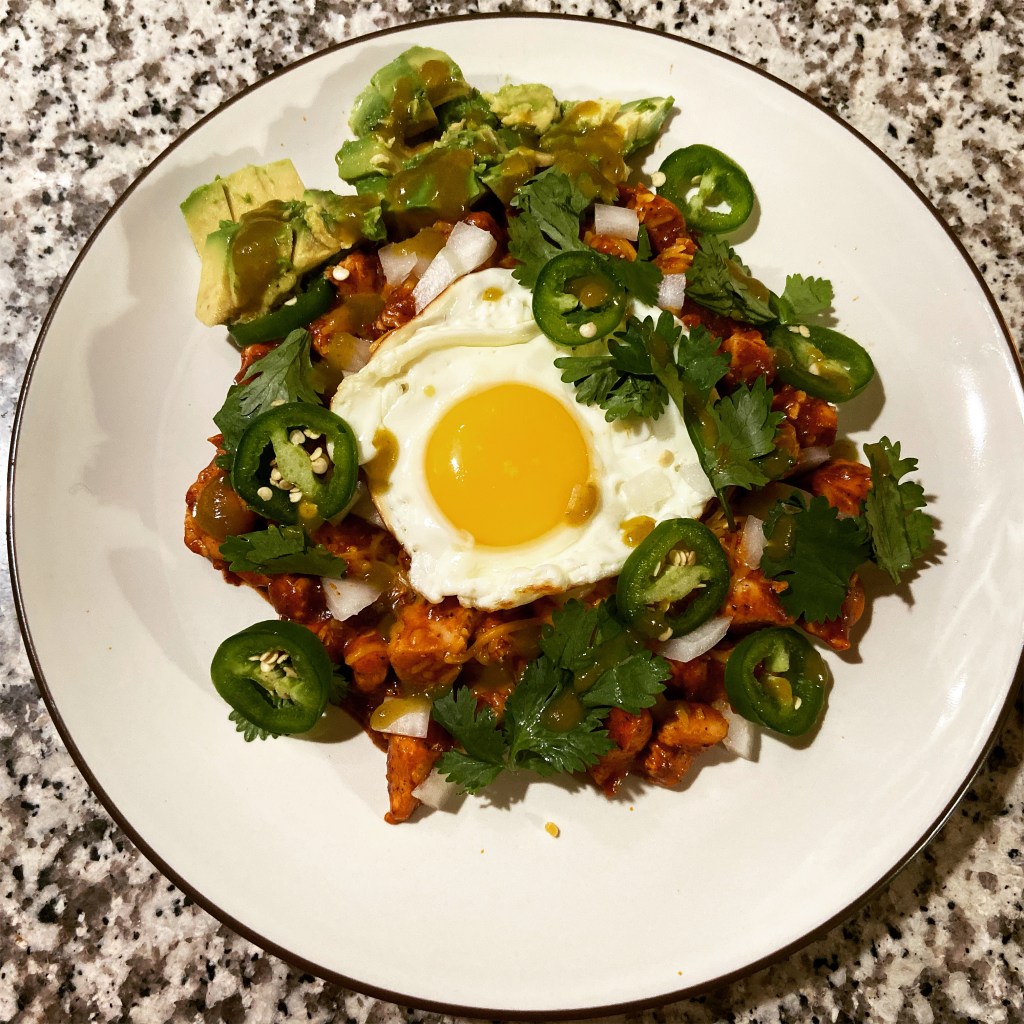 Bekah made her famous enchilada chicken.   Another simple recipe you really can’t go wrong with.  Sunny side egg was my contribution.