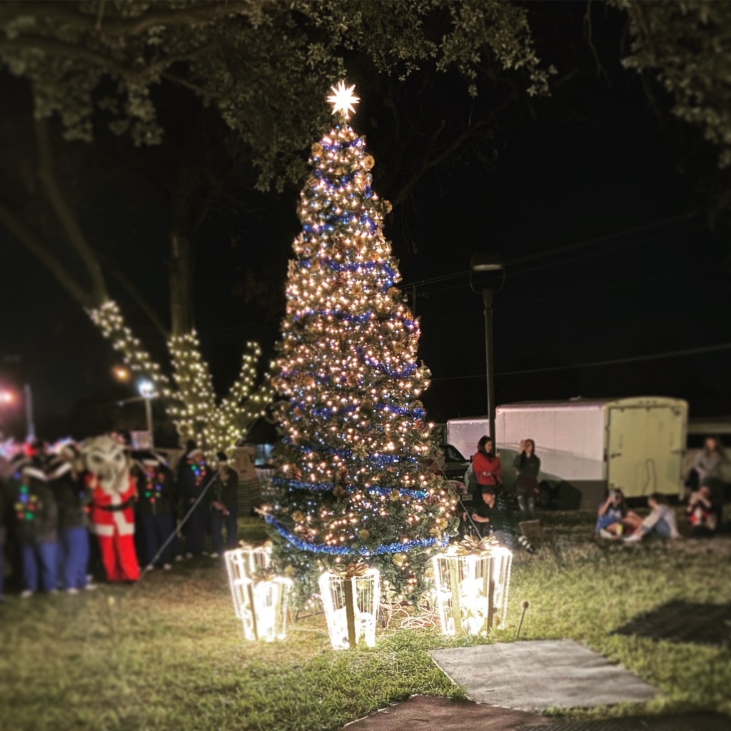 The annual Christmas tree lighting. I meandered my way up the road from my house to meet some campus friends for the event. Jamie, the expert on campus life, & 2 others who had never been to the ceremony. Virgins to the tree lighting. This was my second year. We sat and chatted, waiting for the clock to get a little closer to 6:30 before we all made our way to the crowd. And boy was there a crowd. It was spread out more this year and that’s good because I swear more people showed up. They had blow up slides, ornament decorating, synthetic ice skating (what is that anyway?) & all sorts of things for the kids. We were there for the lighting. If I hadn’t know the location of the tree it would have been hard to spot in the dark oak grove. We made ourselves through the many bodies to the tree. About 15 min to go and all would be illuminated. Lurking in the shadows was a very belly sick electrician. It was his duty to flip the switch. It was his wiring that everyone was counting on. What would happen if all remained dark? That was his worry. 10-9-8-7-6-5-4-3-2-1!!!! LIGHTS ON!!! The grove was a spectacle of Christmas lights. Satisfied with what we came for, we all departed to the sound of Christmas carols. Till next year.