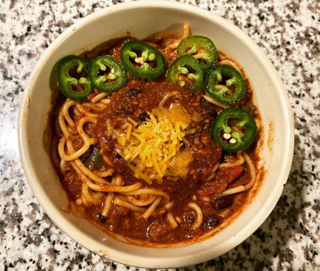 Cincinnati chili. Leftover from a few weeks ago. Frozen and ready to thaw. You just add spaghetti sauce and WHAM! A new meal. Does it sound gross to you? Think about it. Spaghetti and chili are very similar in construct. You just change some of the spices up. Why would noodles in chili be bad? Do you like chili mac? Kind of the same concept. Don’t knock it until you try it. And it’s a great way to keep leftover chili interesting.