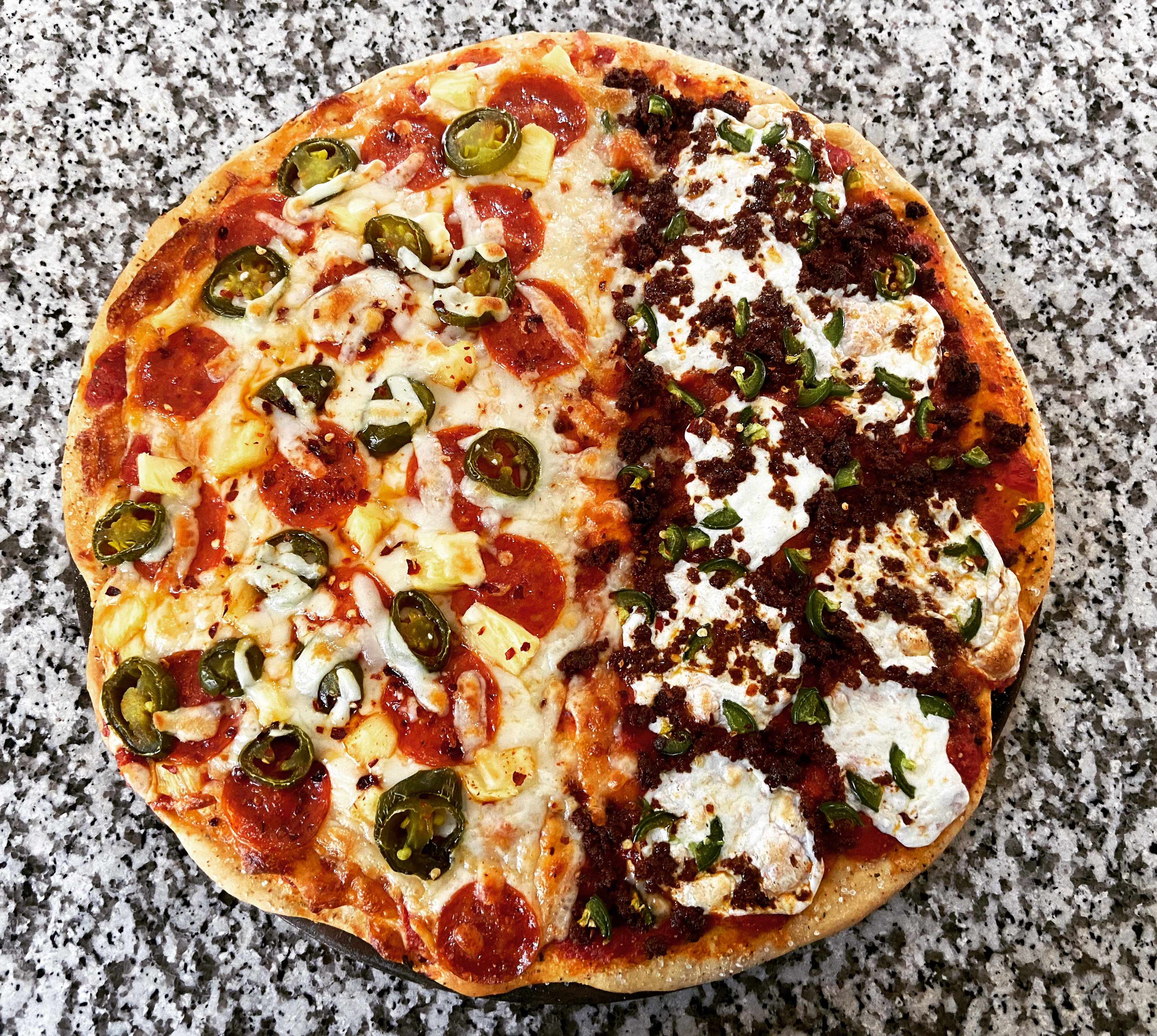 Anywho, it was decided lunch would be pizza. I woke up early to start the dough before our delayed walk. Flour & yeast are high commodities these days. Lucky for me I had some. I kneaded and kneaded. 2 hours later it was alive & double the size. At first I was planing on just making a Hawaiian pizza. Bekah brought up we had leftover chorizo from last weekend and I could make half Hawaiian and half Mexican chorizo. One of our favorite places has this pizza and for some absurd reason that’s the sole pizza that isn’t being offered during this carry out/delivery only time. Makes no sense. I have to say her idea was superb. I’ve never made that pizza and it was fun trying something different. I’m hard pressed to say which half I liked the most. The beer was also pretty good.