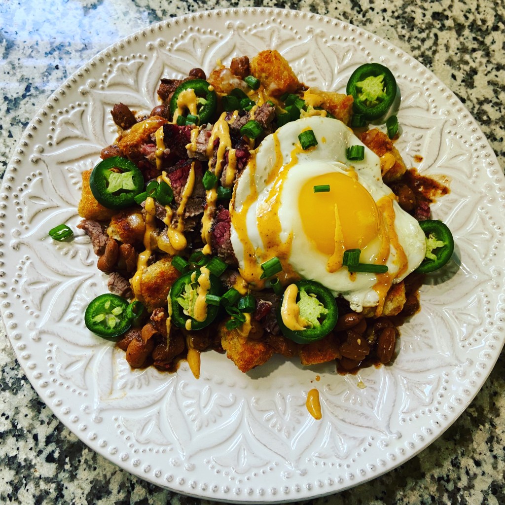 Brisket tater tot hash w/ beans and the works. Such a good experiment.