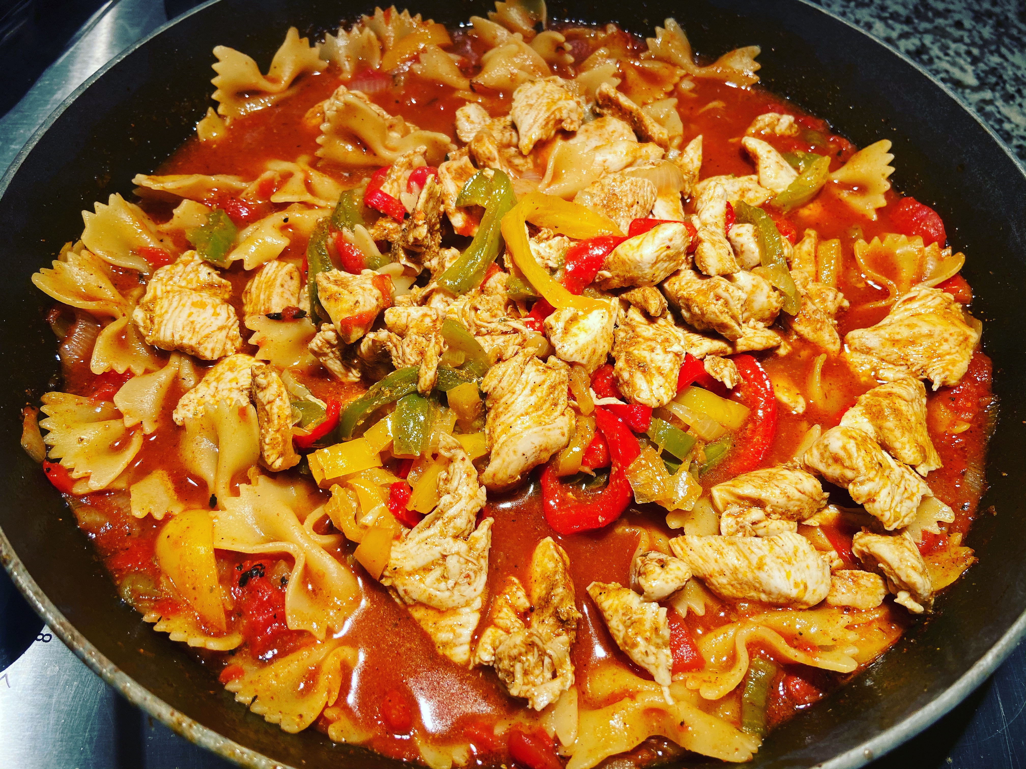 Chicken fajita pasta. No complaints. Simple no brain concept. A hybrid Italian/Mexican meal. Why not. The flavors worked.