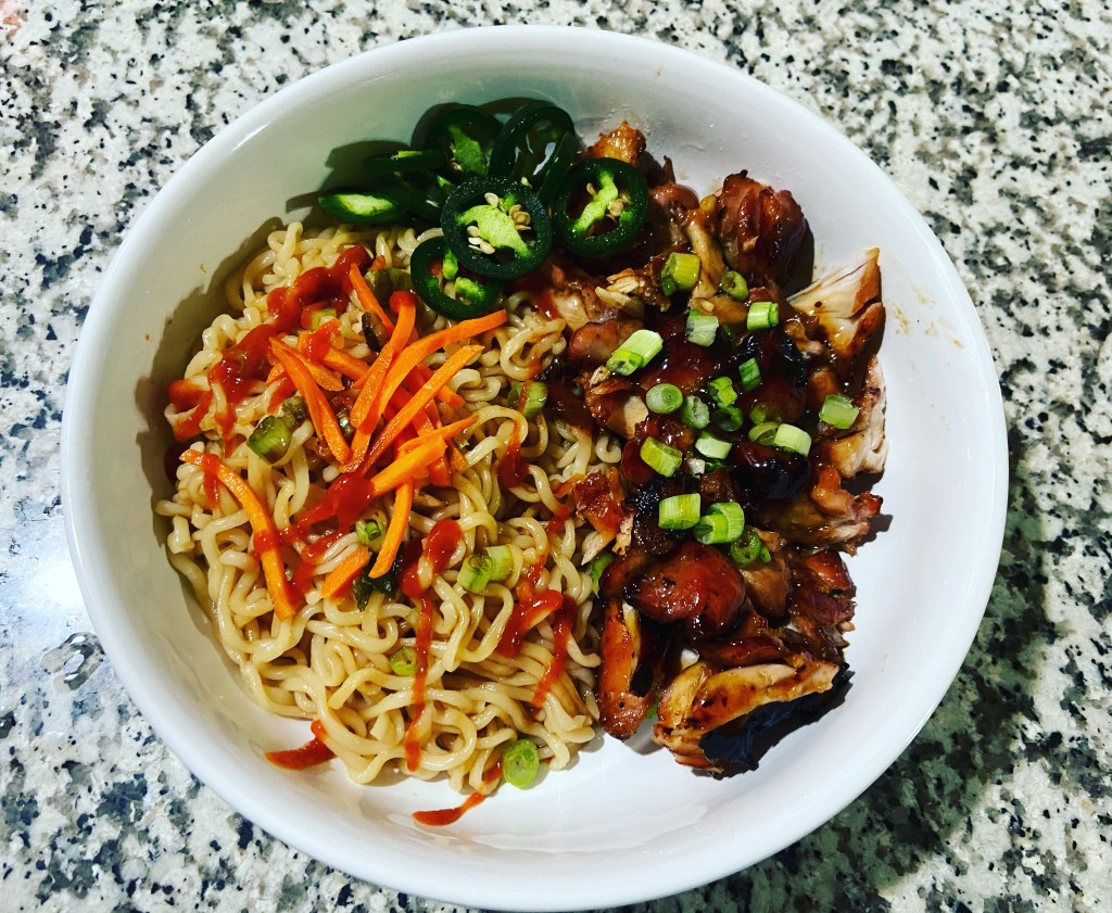 Usually on Friday I have an idea WTH we are having for dinner but not this time. Rummage through the fridge and pantry for ideas. I had chicken thighs. I have ramen noodles. Some Panda Express orange sauce. I can make something of this. Another bowl meal.