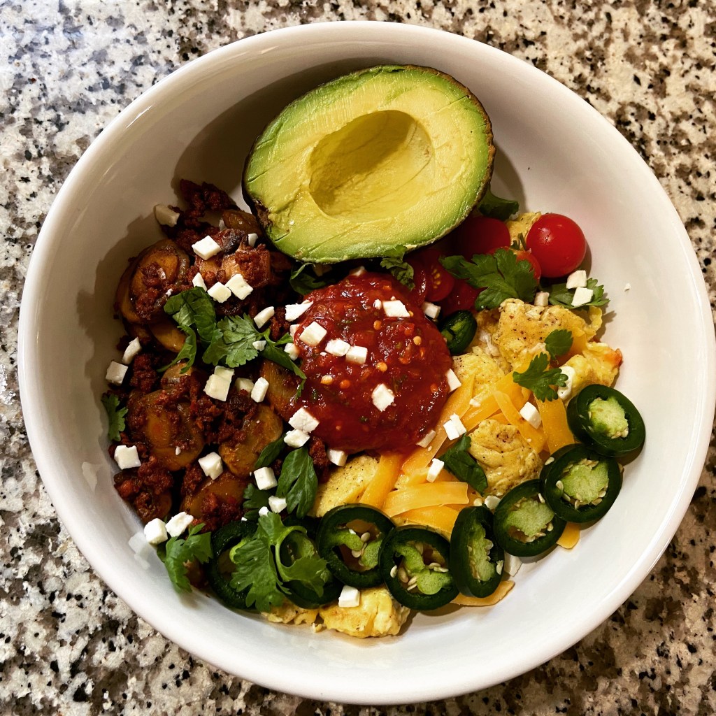 Breakfast burrito bowl. This consist of scrambled eggs, chorizo & mushrooms, avocado, jalapeño, tomatoes and cheese. Bekah is doing the Keto diet and I’m doing my best to help.
