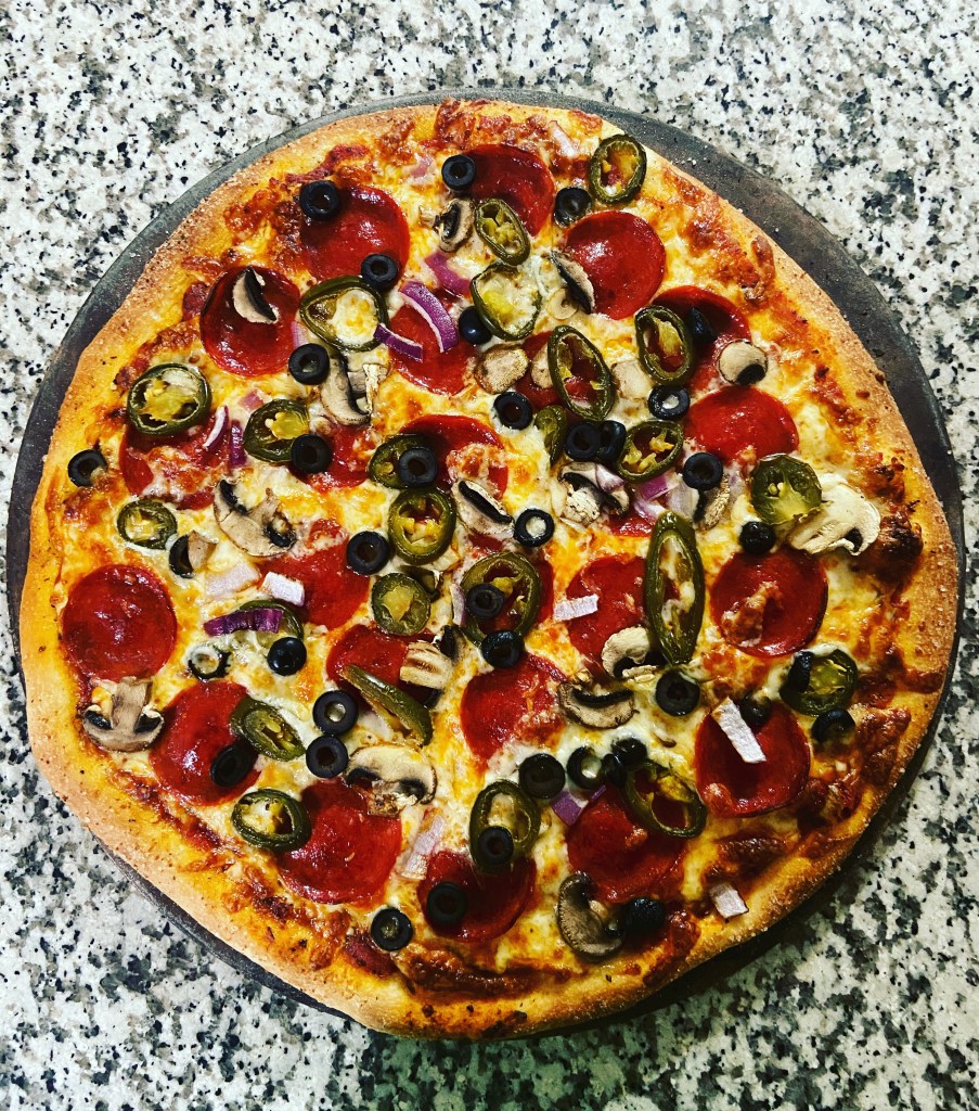 Bekah was gone so I made a pizza from scratch. Pepperoni, jalapeño, red onion, mushrooms, & black olives. Bueno!!!!