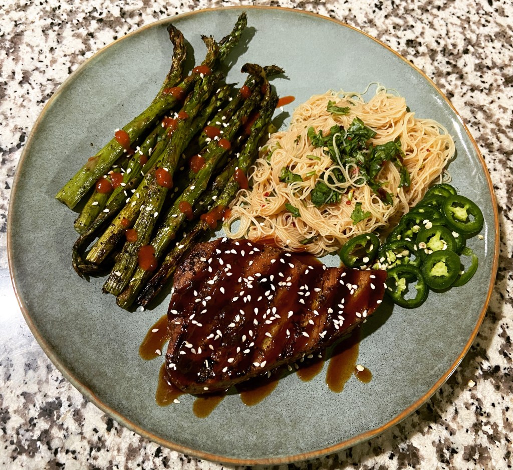 Hoisin tuna steak, asparagus & rice noodles. Cleaning out the freezer meal #3. I’ve done hoisin chicken. Hoisin steak. Hoisin pork tenderloin. Why am I just now doing hoisin tuna? It was so good and so simple. The rice noodles I tossed with rice vinegar, soy sauce & cilantro. Winged it and won. Bekah was impressed. Said it was like watching an episode of Chopped.