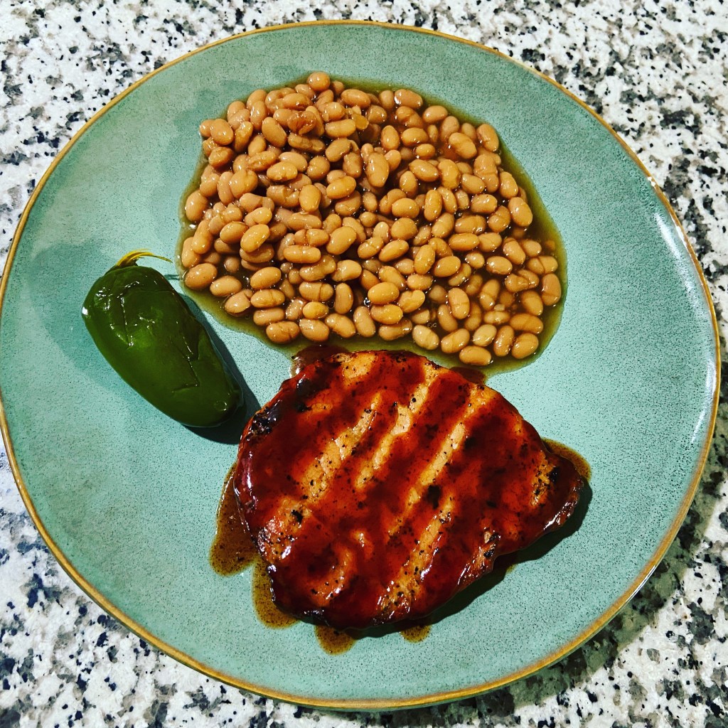 BBQ pork chop with some baked beans. Cleaning out the freezer meal #2. Pretty blah looking meal. It was perfectly cooked and tasty.