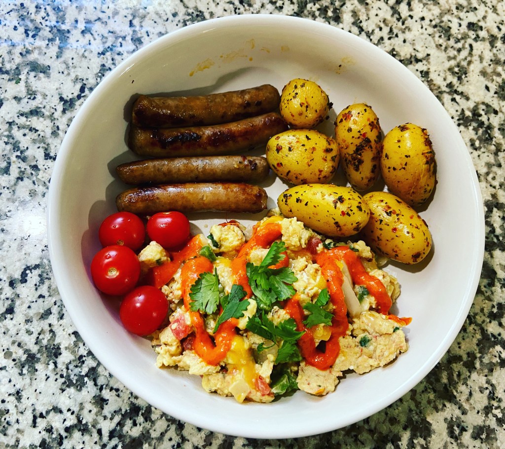 Another breakfast bowl. I cooked some pork sausage links, some seasoned potatoes. For the eggs I threw in some fresh pico del gallo.