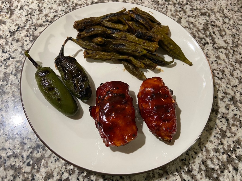 Armidillo eggs with grilled okra. Cleaning out the freezer meal # 1.