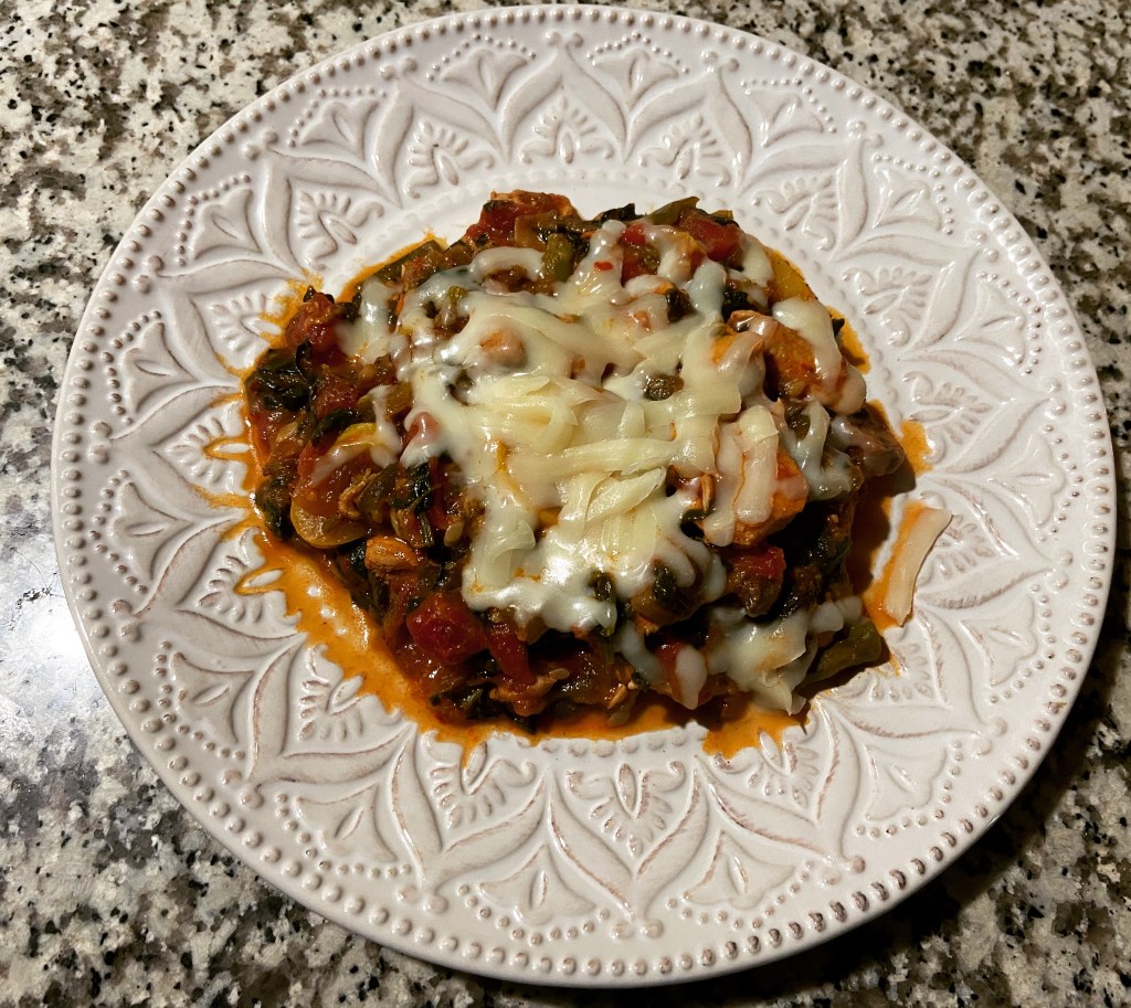 Bekah’s chicken & veggies. It’s been a LONG times since she has made this meal. Always a favorite of mine I was excited to have. Of course it was great. The picture certainly doesn’t do it justice. That’s a mixture of chicken, tomato’s, mushrooms, asparagus, yellow squash & spinach. Seasonings and cheese. Love it.