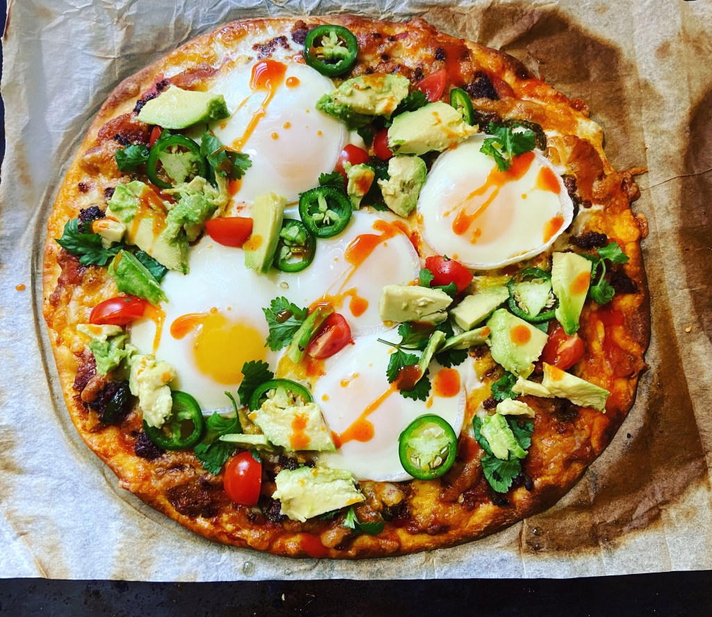 Huevos rancheros pizza. I have been wanting to make a breakfast pizza for months not and I always chickened out. I was intimidated by the idea. Wasn’t sure what steps to take. Had different ideas and couldn’t settle on one. What do I use for the sauce. What protein to use with the eggs. I was so indecisive. I finally settled on it. Just make it already. I layered with spicy tomato sauce, refried beans, chorizo & jalapeño topped with cheddar cheese. Now how do I keep the eggs from going all over the place? How about onion rings? Crack the egg into the rings and it stays firmly in place. So I baked for 15 min. Wasn’t sure how baked eggs would be but they surprised me by not being runny. The yokes had a custard like texture. Garnished with fresh jalapeño, avocado & cilantro. We were all very impressed. It was amazing.