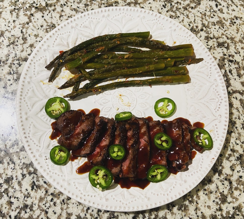 Soy glazed beef tenderloin w/ miso ginger sautéed asparagus. Basically how I make my tuna but with steak. Which is better, I don’t know.