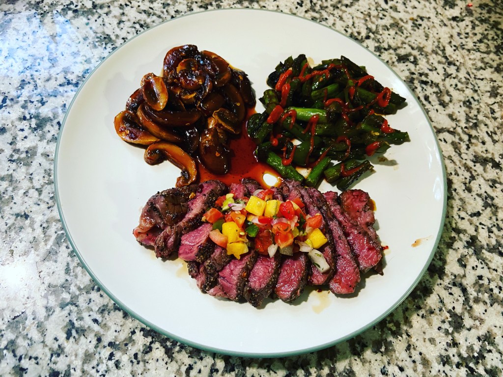 Teriyaki steak with mushroom, asparagus and jalapeño.