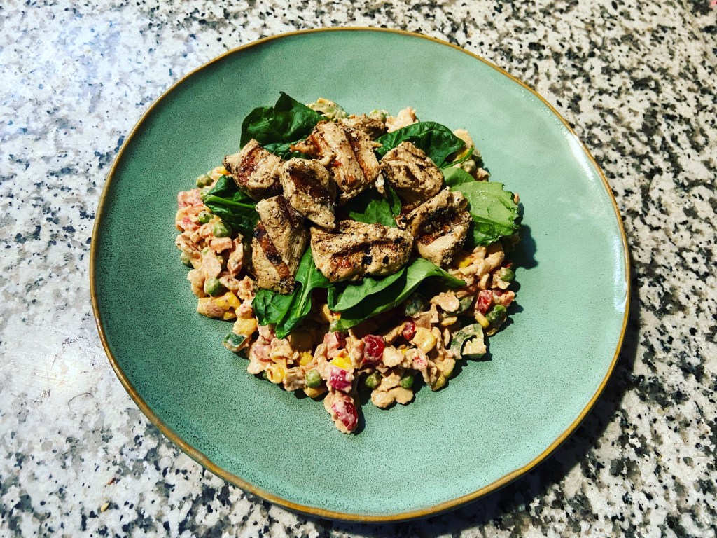 Bow tie pasta salad w/ corn, peas, carrots, tomato, jalapeño, ranch, salsa, cheese, spinach & grilled chicken. Heaven on a hot summer day.