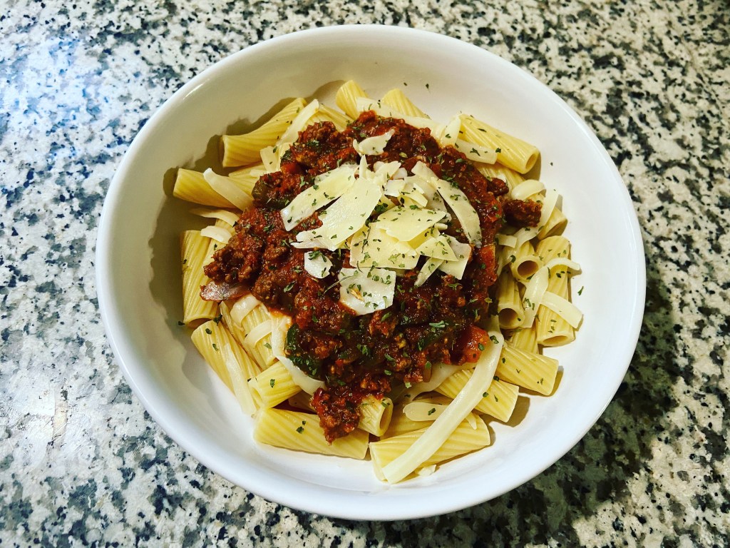 Rigatoni with a meat marinara sauce.