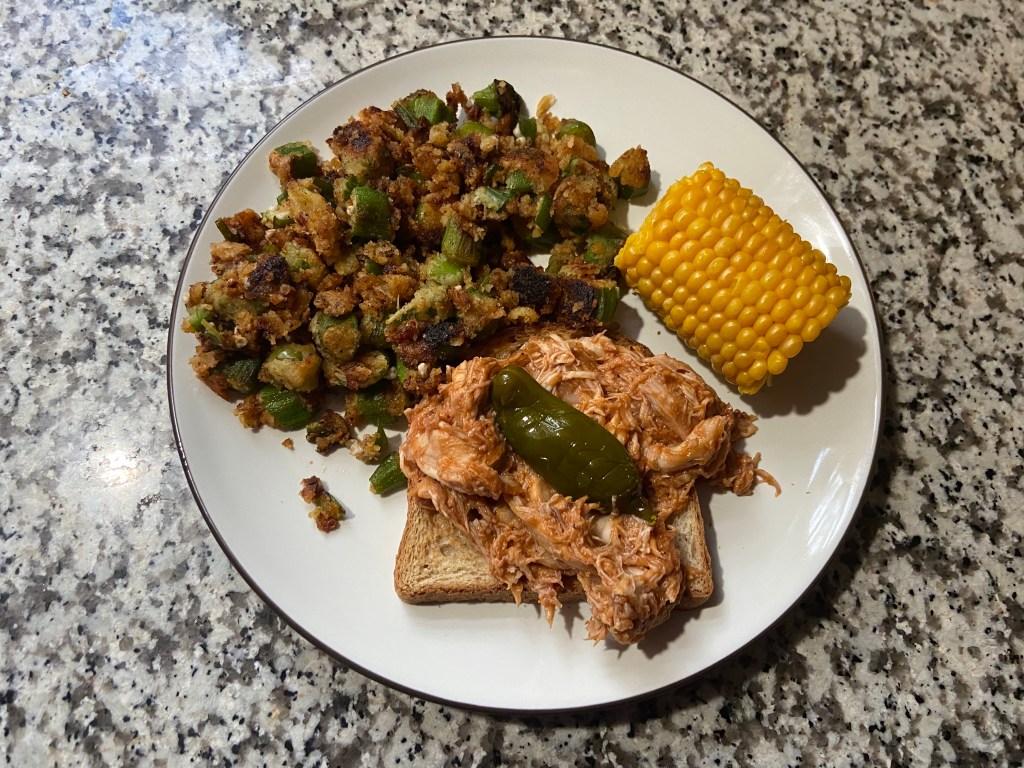BBQ pulled chicken, fried okra and corn.
