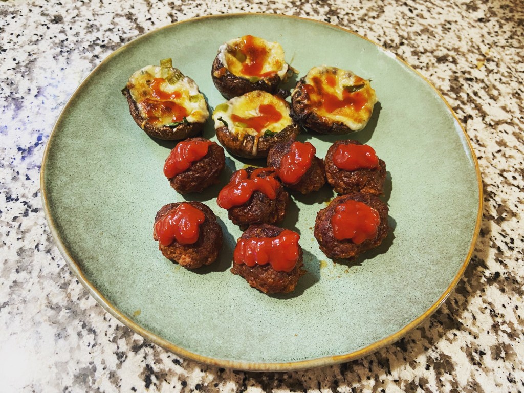 Meatloaf meatballs and stuffed mushrooms.