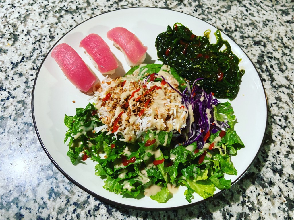 Raw tun, seaweed salad and no rice poke.