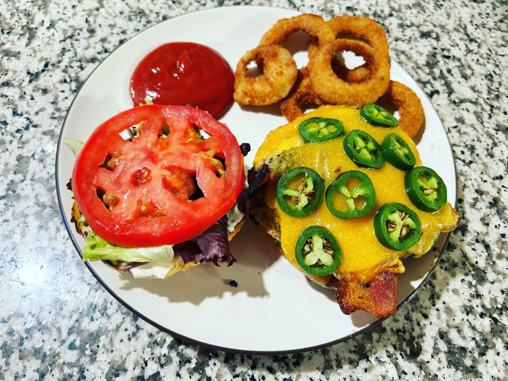 Chicken burger with bacon, cheddar and onion rings.