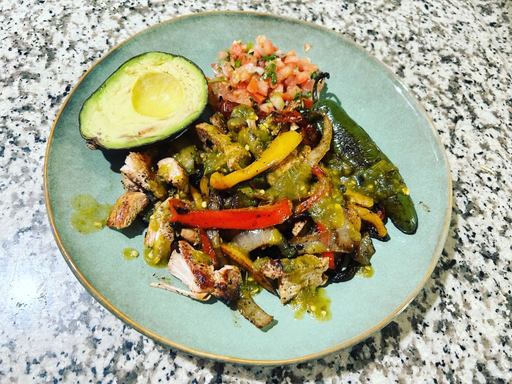 Spicy chicken thigh with peppers and onion.