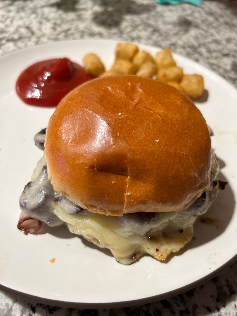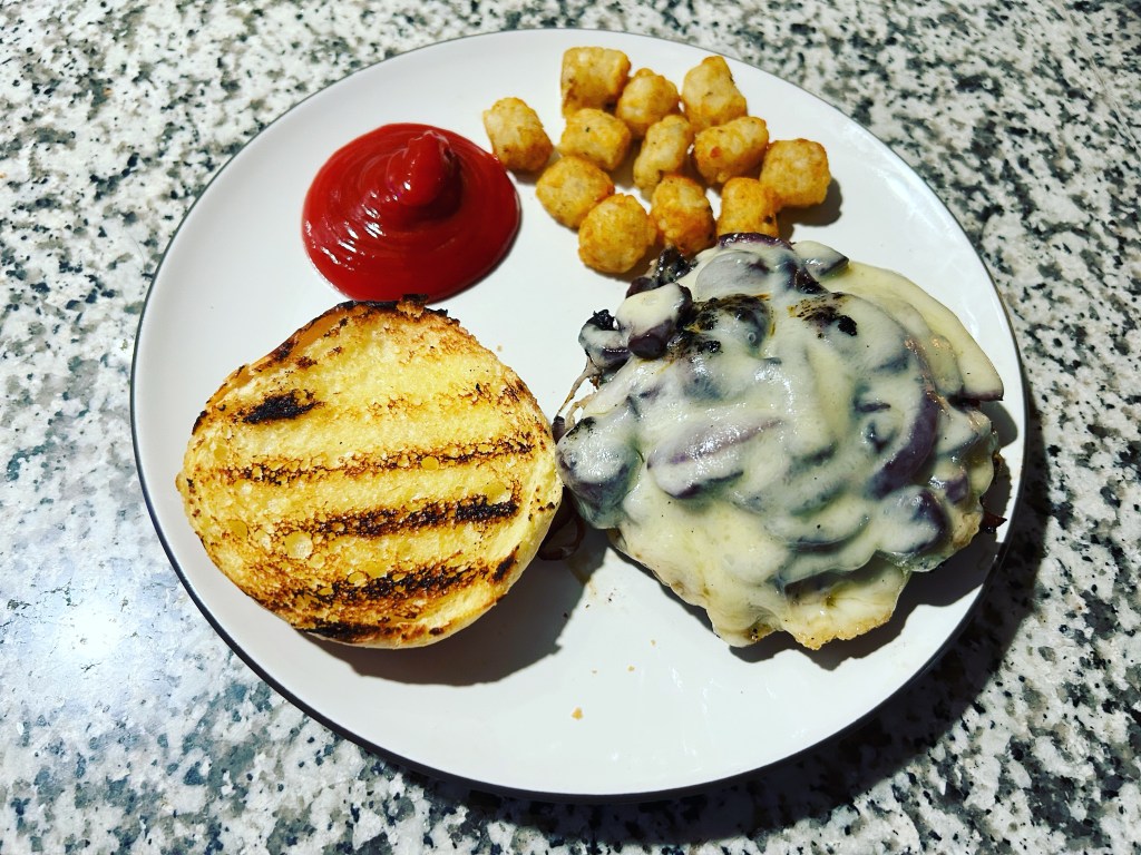 Chicken mushroom Swiss burger w/ tots