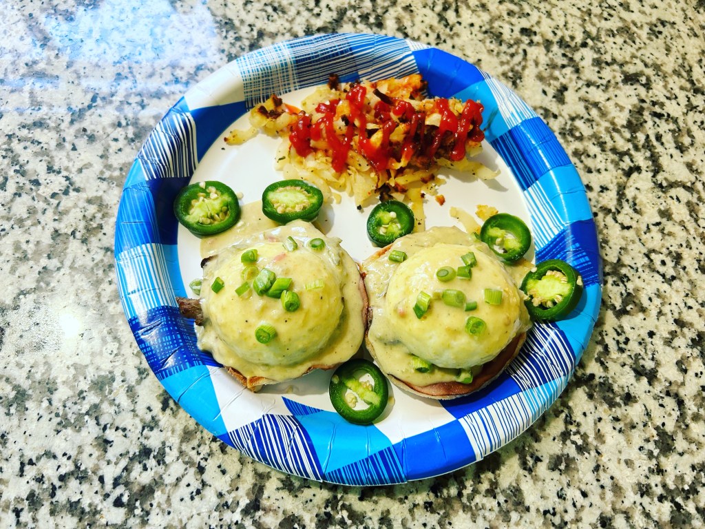 Saturday I cooked for Yvette 2 meals. She got eggs Benedict with sausage, hame and a spicy green hollandaise sauce served with hash browns for brunch. Dinner was my orange chicken stir-fry.