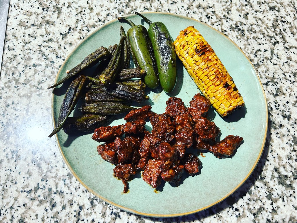 BBQ steak bites with grill okra and corn on the cob. I had jalapeño with mine.