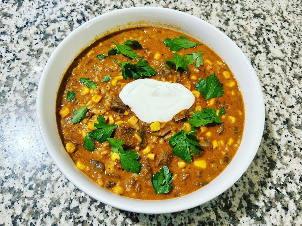 It turned out to be a soup day in May. It gave me the opportunity to clean out my fridge. I had some Hungarian beef mushroom soup I could eat. I added corn and rice. It rocked.