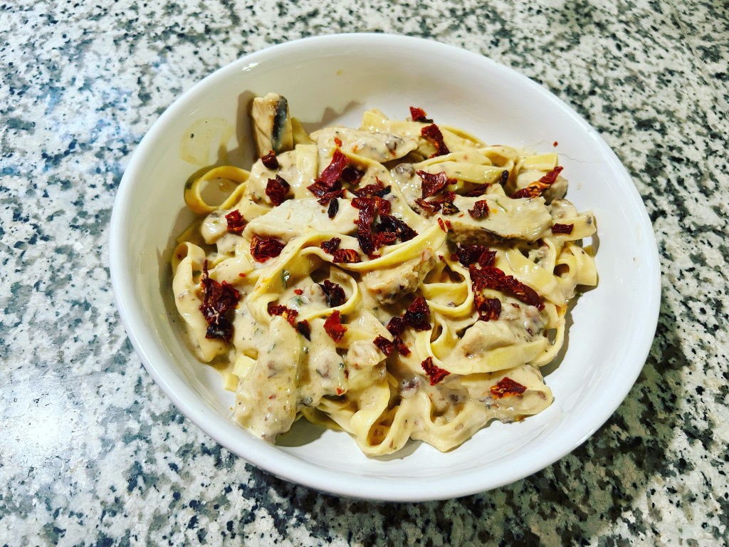 No date night. 😦 Pasta with grilled chicken, bacon, sun dried tomatoes and a carbonara sauce. I’ve made this before and it was a treat.