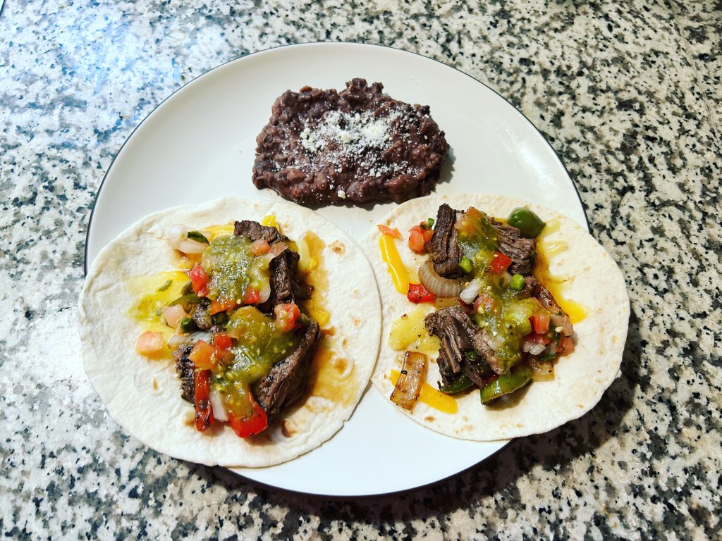 Steak fajita tacos & black beans.