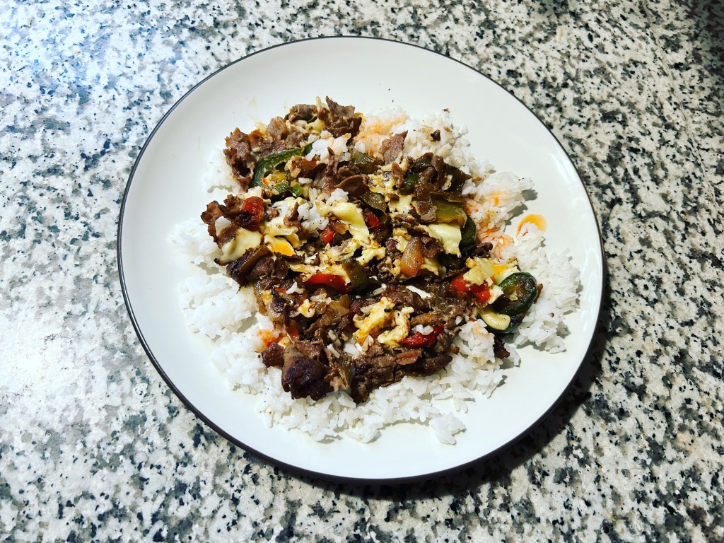 Philly cheese steak over white rice. It was perfection.